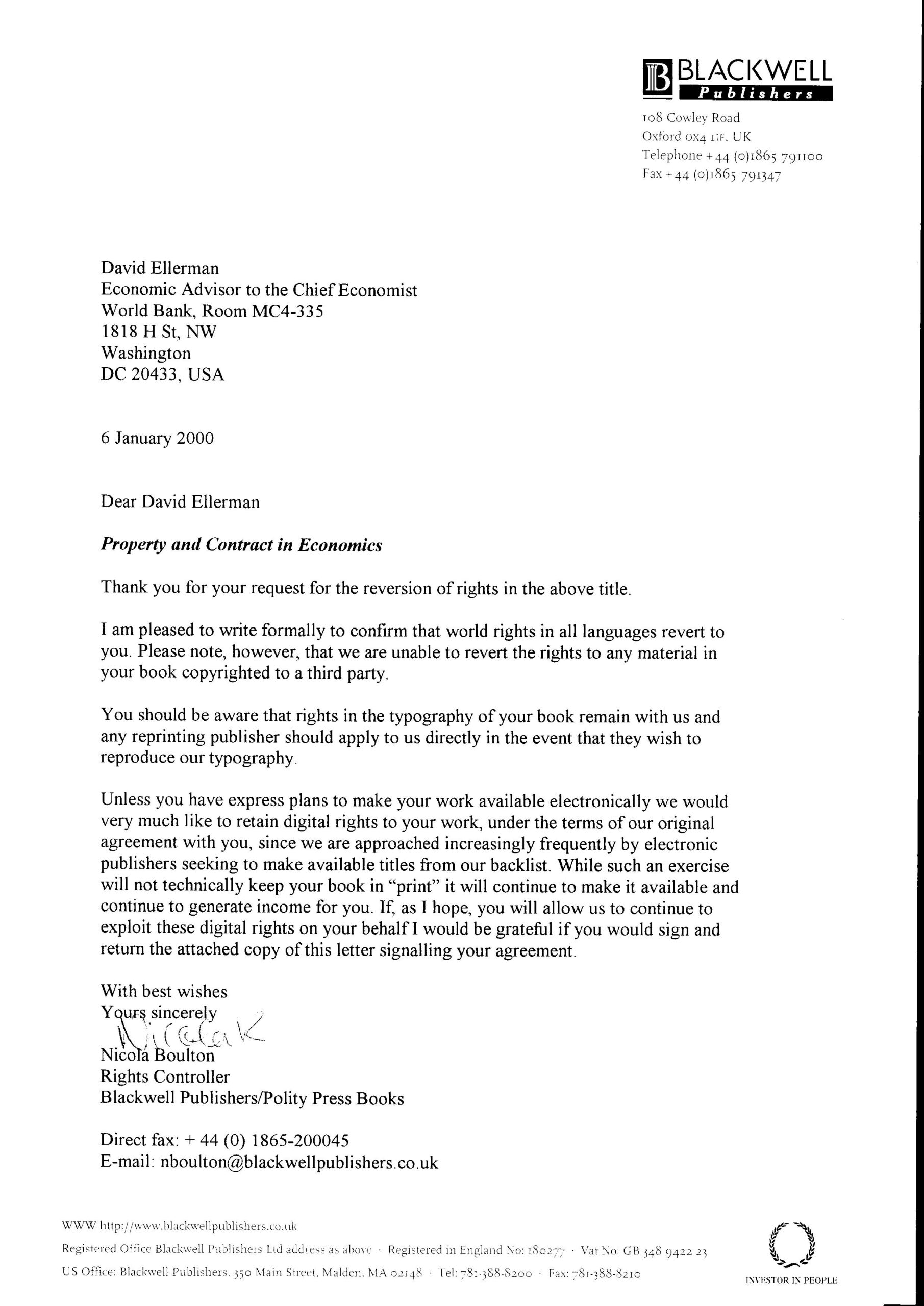This book presents a modern version of the old Labor (or Natural Rights) Theory of Property and of an Inalienable Rights Theory that descends from the Reformation and Enlightenment. Together these theories re-solve the basic problem of distribution in the sense of giving a basis for the just appropriation of property and a basis for answering the question of who is to be the firm, e.g., the suppliers of share capital as in conventional capital, the government as in socialism, or the people who work in the firm as in the system of economic democracy (or labor-managed market economies). While these theories address old questions in economics, they do so in an entirely different manner than conventional economics which renders the questions as being about value or price theory (instead of about property rights and contracts). This book is now out of print and the rights have reverted to the author.